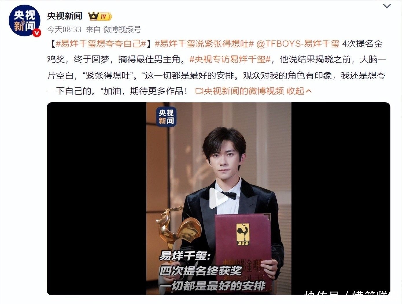 11. 奖项揭晓后不久,央视第一时间推出对易烊千玺的独家专访,将他的成长历程置于公众视野中心。